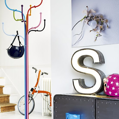 Just nu är det lekfullhet och originalitet som gäller och gärna lite oväntade kombinationer. Hos Living Etc aprilnumret fanns en spännande mix med färgglada metallstolar blandat med ett slitet gammalt allmogeskåp. Funkar förvånansvärt bra. Industrikänslan med stora bokstäver och metallskåp med nitar kombineras med klassisk klädhängare i nya färger. Det gamla allmogeskåpet har fått överdimensionerade bestick (från Artefact) som prydnad. Både lite originellt och oväntat. Idéen med att måla en extra skugga bakom prydnadssakerna på spisen känns också lite kul och får åtminstone mig att tänka på atljétrenden. Kanske är det också en kul idé att ta efter. Bilder från Living Etc.