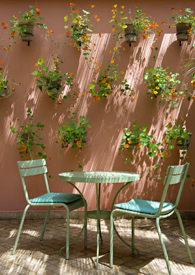 Fint också att duka med grönt och använda gröna trädgårdsmöbler. En helt annan grön färg den här gången med en liten dragning åt Marocko dessutom. Lägg märke till krukväggen - så fin!